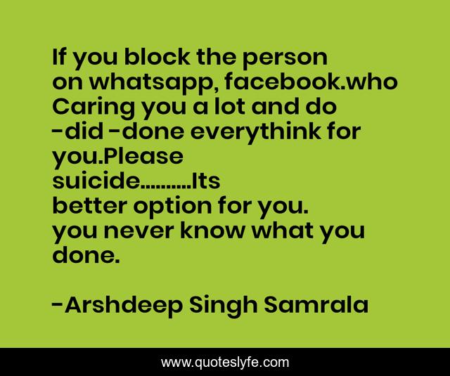 This page presents the quote "If you block the person on whatsapp, facebook.who Caring you a lot and do -did -done everythink for you.Please suicide..........Its better option for you. you never know what you done.". Author of this quote is Arshdeep Singh Samrala. This quote is about caring, true-love, caring-person, friendship-and-love, love-story, friendship,.