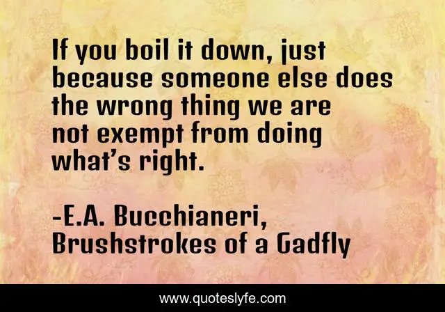 This page presents the quote "If you boil it down, just because someone else does the wrong thing we are not exempt from doing what’s right.". Author of this quote is E.A. Bucchianeri, Brushstrokes of a Gadfly. This quote is about catholic, good, christian, wisdom-inspirational, morals, good-advice, gadfly, goodness, wisdom,.