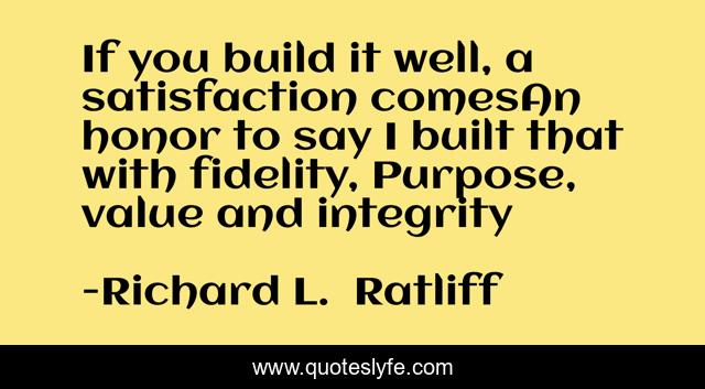 This page presents the quote "If you build it well, a satisfaction comesAn honor to say I built that with fidelity, Purpose, value and integrity". Author of this quote is Richard L. Ratliff. This quote is about building, hardwork, wise-words, wise, working, philosophy, value, honor, satisfaction,.