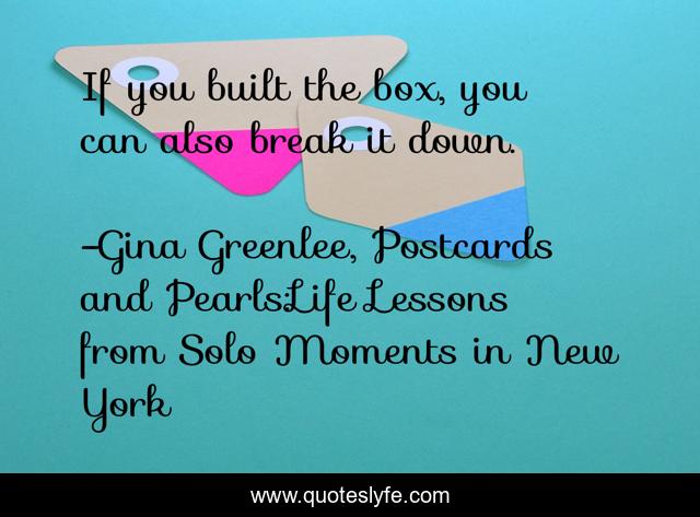 This page presents the quote "If you built the box, you can also break it down.". Author of this quote is Gina Greenlee, Postcards and Pearls:Life Lessons from Solo Moments in New York. This quote is about travel, new-york-city, new-york-travel, travel-writing, traveling,.
