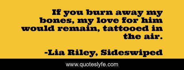 This page presents the quote "If you burn away my bones, my love for him would remain, tattooed in the air.". Author of this quote is Lia Riley, Sideswiped. This quote is about new-adult, swoon, romance-novels,.