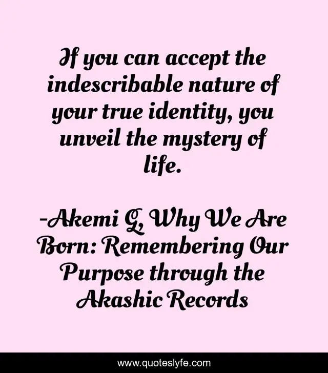This page presents the quote "If you can accept the indescribable nature of your true identity, you unveil the mystery of life.". Author of this quote is Akemi G, Why We Are Born: Remembering Our Purpose through the Akashic Records. This quote is about who-am-i, soul, identity,.