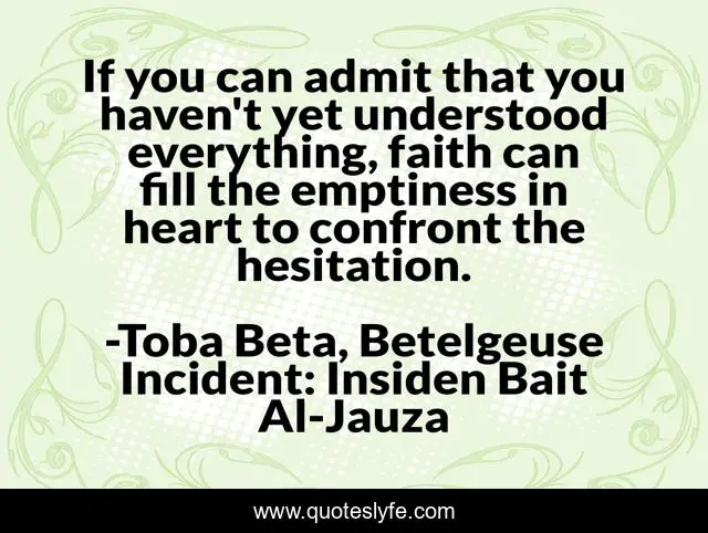 This page presents the quote "If you can admit that you haven't yet understood everything, faith can fill the emptiness in heart to confront the hesitation.". Author of this quote is Toba Beta, Betelgeuse Incident: Insiden Bait Al-Jauza. This quote is about conftront, faith, emptiness-in-heart, hesitation, understanding,.