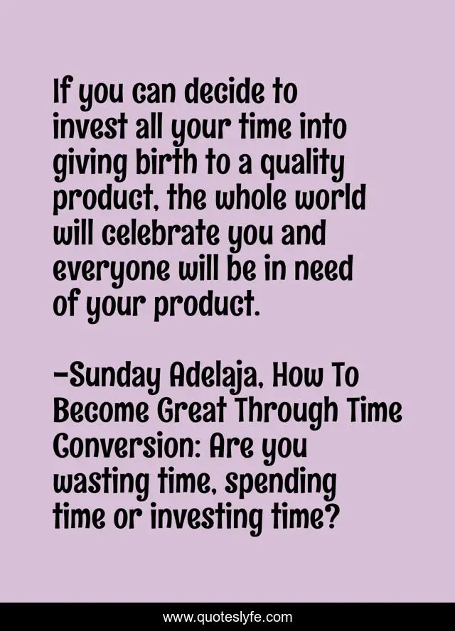 This page presents the quote "If you can decide to invest all your time into giving birth to a quality product, the whole world will celebrate you and everyone will be in need of your product.". Author of this quote is Sunday Adelaja, How To Become Great Through Time Conversion: Are you wasting time, spending time or investing time?. This quote is about life, investment, conversion, productivity, wealth, decision, time-investment, greatness, waste,.