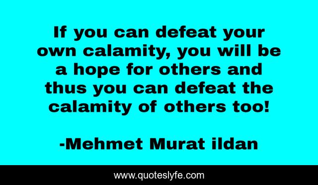 This page presents the quote "If you can defeat your own calamity, you will be a hope for others and thus you can defeat the calamity of others too!". Author of this quote is Mehmet Murat ildan. This quote is about mehmet-murat-ildan, ildan-wise-sayings, turkish, ildan-wisdom, turkish-playwrights, turkish-wisdom-words, calamity, turkish-authors, turkish-literature,.