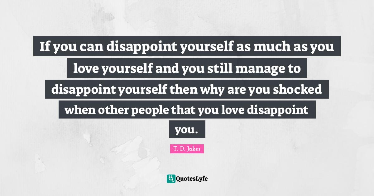 This page presents the quote "If you can disappoint yourself as much as you love yourself and you still manage to disappoint yourself then why are you shocked when other people that you love disappoint you.". Author of this quote is T. D. Jakes. This quote is about love, people, shocked, manage, love yourself, love you, disappoint,.