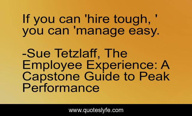 This page presents the quote "If you can 'hire tough, ' you can 'manage easy.". Author of this quote is Sue Tetzlaff, The Employee Experience: A Capstone Guide to Peak Performance. This quote is about leadership-in-business, hiring, business, hiring-method, management-and-leadership,.