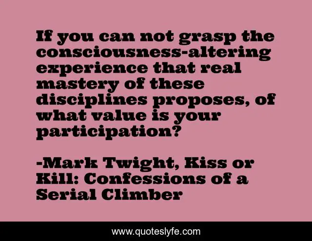 This page presents the quote "If you can not grasp the consciousness-altering experience that real mastery of these disciplines proposes, of what value is your participation?". Author of this quote is Mark Twight, Kiss or Kill: Confessions of a Serial Climber. This quote is about personal-development, kick-ass, point-blank,.