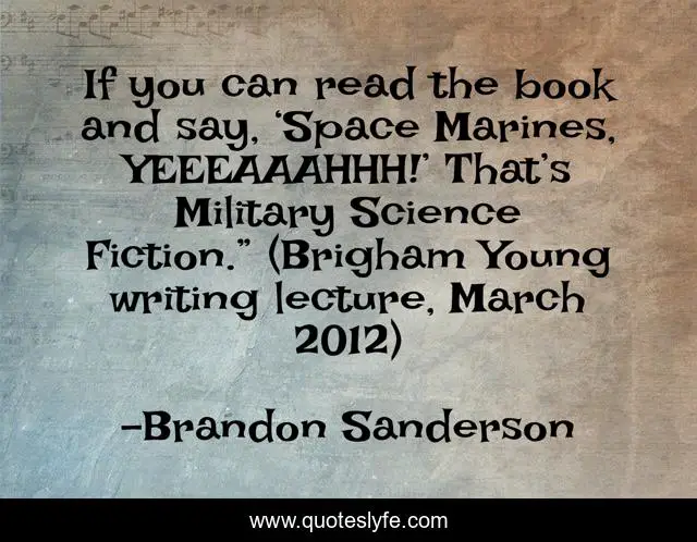 This page presents the quote "If you can read the book and say, ‘Space Marines, YEEEAAAHHH!’ That’s Military Science Fiction.” (Brigham Young writing lecture, March 2012)". Author of this quote is Brandon Sanderson. This quote is about brandon-sanderson, military-sf, science-fiction, writing,.