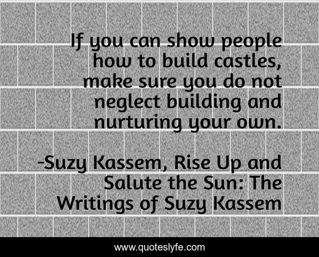 This page presents the quote "If you can show people how to build castles, make sure you do not neglect building and nurturing your own.". Author of this quote is Suzy Kassem, Rise Up and Salute the Sun: The Writings of Suzy Kassem. This quote is about castles, motivation, being, optimistic, neglecting, living, confidence, wealth, guru,.