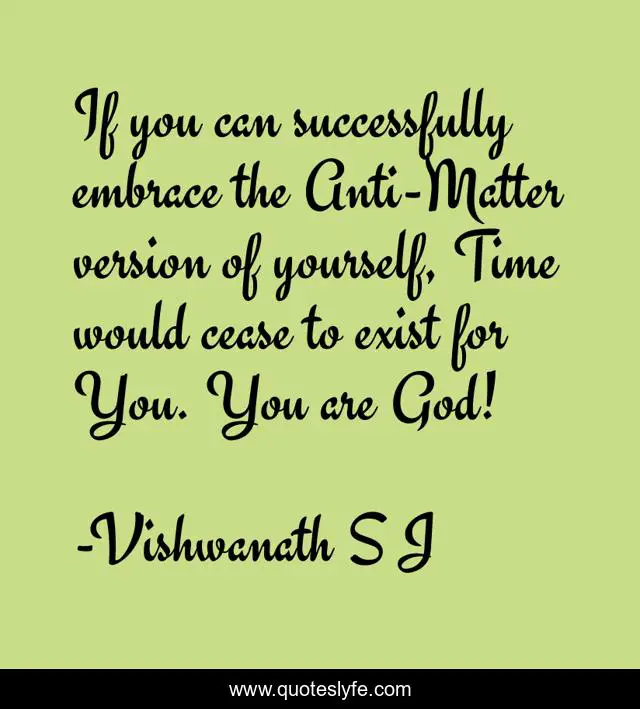 This page presents the quote "If you can successfully embrace the Anti-Matter version of yourself, Time would cease to exist for You. You are God!". Author of this quote is Vishwanath S J. This quote is about chapter, life, philosophy, dark-matter, anti-matter, quote, time-travel, mind, interstellar,.