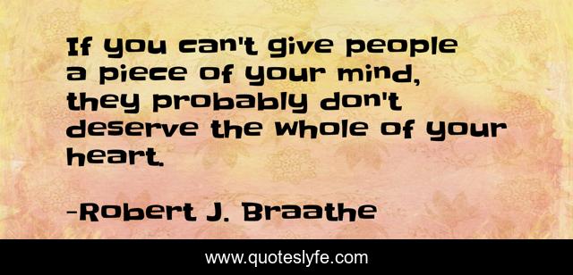 This page presents the quote "If you can't give people a piece of your mind, they probably don't deserve the whole of your heart.". Author of this quote is Robert J. Braathe. This quote is about heart, mind-body-spirit,.