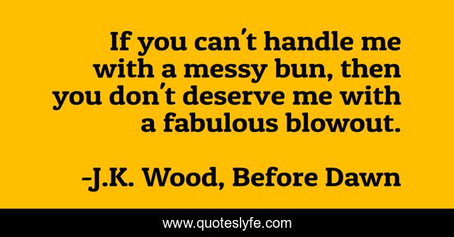 This page presents the quote "If you can't handle me with a messy bun, then you don't deserve me with a fabulous blowout.". Author of this quote is J.K. Wood, Before Dawn. This quote is about enthusiasm, humor, beauty, inspirational,.