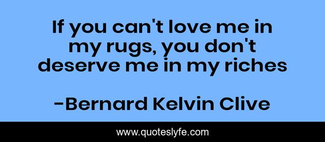 This page presents the quote "If you can't love me in my rugs, you don't deserve me in my riches". Author of this quote is Bernard Kelvin Clive. This quote is about love, wealth, relationship, relationship-advice, riches, dating, affection,.