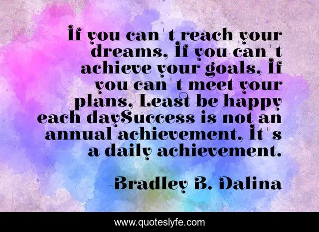 This page presents the quote "If you can't reach your dreams, If you can't achieve your goals, If you can't meet your plans, Least be happy each daySuccess is not an annual achievement, It's a daily achievement.". Author of this quote is Bradley B. Dalina. This quote is about achievements, plans, success, bradley, bradley-b-dalina, goals, dreams,.
