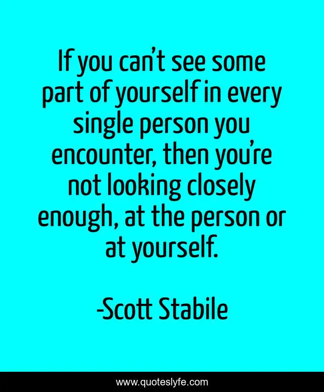 This page presents the quote "If you can’t see some part of yourself in every single person you encounter, then you’re not looking closely enough, at the person or at yourself.". Author of this quote is Scott Stabile. This quote is about compassion, life, kindness, love, affection,.