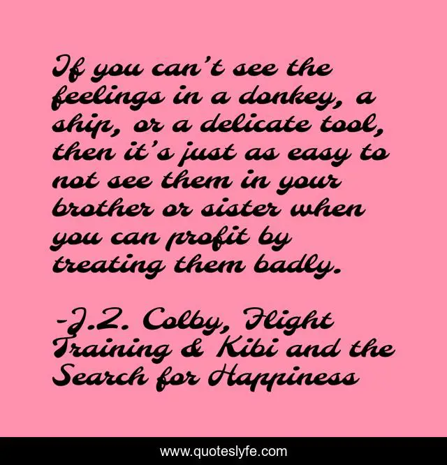 This page presents the quote "If you can’t see the feelings in a donkey, a ship, or a delicate tool, then it’s just as easy to not see them in your brother or sister when you can profit by treating them badly.". Author of this quote is J.Z. Colby, Flight Training & Kibi and the Search for Happiness. This quote is about nebador, politics, ethics,.