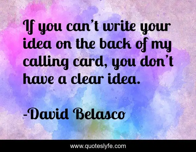 This page presents the quote "If you can’t write your idea on the back of my calling card, you don’t have a clear idea.". Author of this quote is David Belasco. This quote is about communication, startup, idea, business, entrepreneurship,.