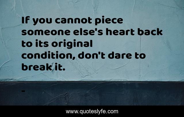 This page presents the quote "If you cannot piece someone else's heart back to its original condition, don't dare to break it.". Author of this quote is . This quote is about broken-heart, relationships, love, relationship, edmond-mbiaka, heart-break, breaking-someone-else-s-heart, affection,.