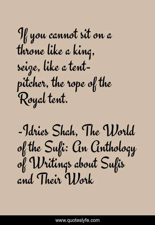 This page presents the quote "If you cannot sit on a throne like a king, seize, like a tent-pitcher, the rope of the Royal tent.". Author of this quote is Idries Shah, The World of the Sufi: An Anthology of Writings about Sufis and Their Work. This quote is about rumi, sufis, sufism,.