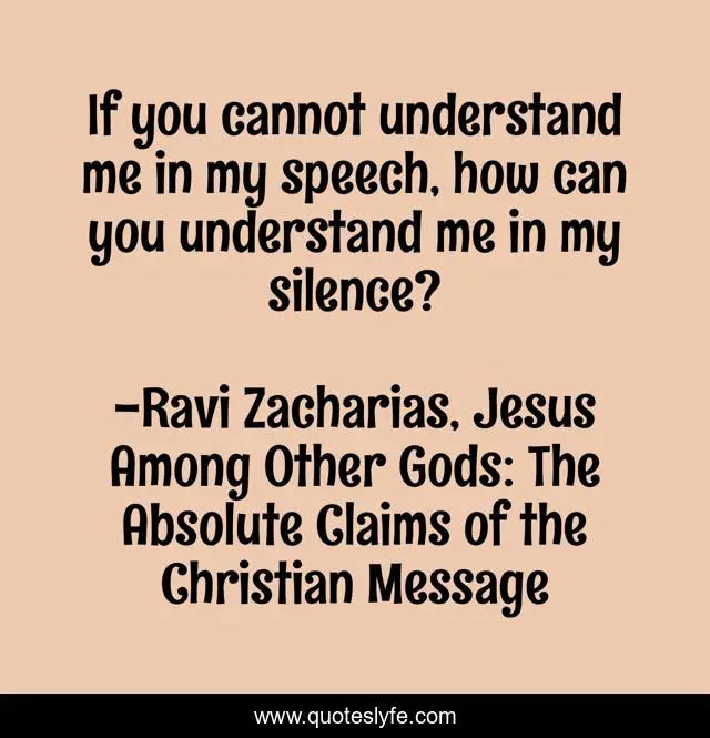 This page presents the quote "If you cannot understand me in my speech, how can you understand me in my silence?". Author of this quote is Ravi Zacharias, Jesus Among Other Gods: The Absolute Claims of the Christian Message. This quote is about silence-speaks, speech, understand, silence,.