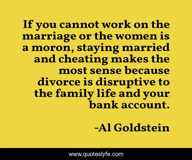 This page presents the quote "If you cannot work on the marriage or the women is a moron, staying married and cheating makes the most sense because divorce is disruptive to the family life and your bank account.". Author of this quote is Al Goldstein. This quote is about life, work, family,.