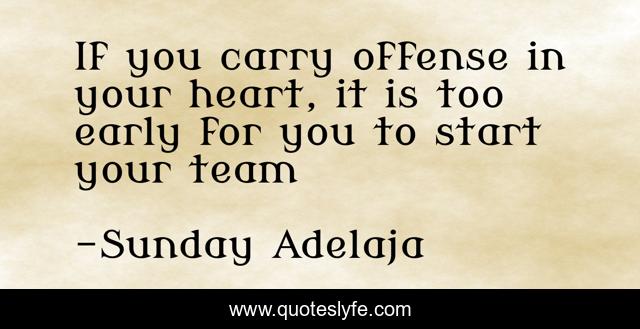 This page presents the quote "If you carry offense in your heart, it is too early for you to start your team". Author of this quote is Sunday Adelaja. This quote is about offense, forgiveness,.