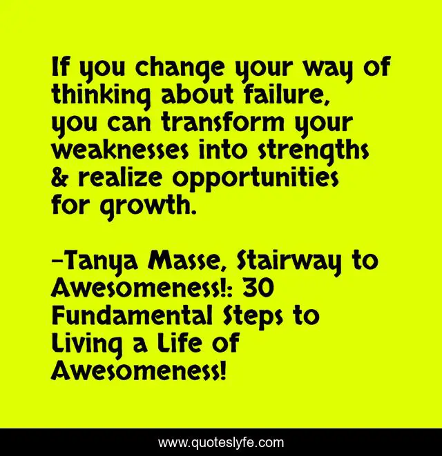 This page presents the quote "If you change your way of thinking about failure, you can transform your weaknesses into strengths & realize opportunities for growth.". Author of this quote is Tanya Masse, Stairway to Awesomeness!: 30 Fundamental Steps to Living a Life of Awesomeness!. This quote is about quotes, quotes-about-life, self-realization, self-improvement, self-help, quotes-to-live-by, stairway-to-awesomeness,.