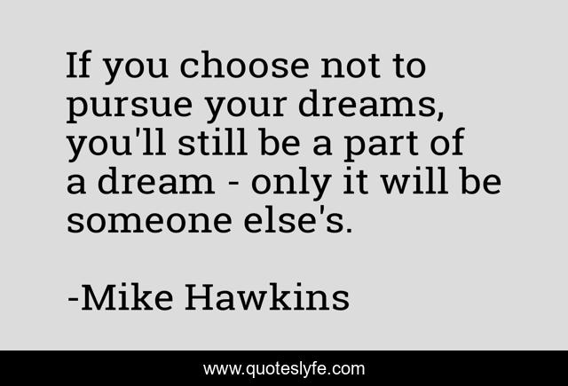 This page presents the quote "If you choose not to pursue your dreams, you'll still be a part of a dream - only it will be someone else's.". Author of this quote is Mike Hawkins. This quote is about your dreams, dream,.