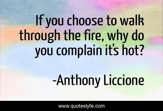 This page presents the quote "If you choose to walk through the fire, why do you complain it's hot?". Author of this quote is Anthony Liccione. This quote is about complaint, free-will, choice,.