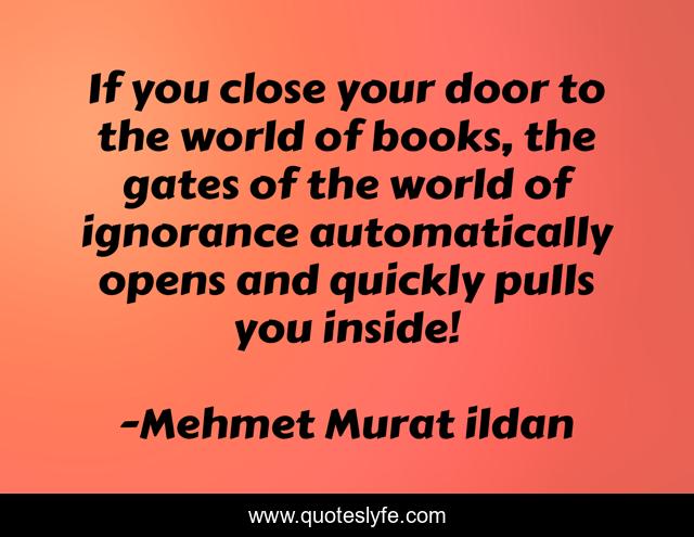 This page presents the quote "If you close your door to the world of books, the gates of the world of ignorance automatically opens and quickly pulls you inside!". Author of this quote is Mehmet Murat ildan. This quote is about gates, door, mehmet-murat-ildan, ildan-wise-sayings, turkish, ildan-wisdom, books, turkish-playwrights, ignorance,.