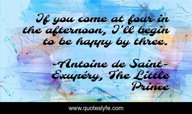 This page presents the quote "If you come at four in the afternoon, I'll begin to be happy by three.". Author of this quote is Antoine de Saint-Exupéry, The Little Prince. This quote is about anticipation, visit, afternoon, friend, happy,.