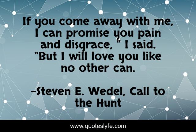 This page presents the quote "If you come away with me, I can promise you pain and disgrace, ” I said. “But I will love you like no other can.". Author of this quote is Steven E. Wedel, Call to the Hunt. This quote is about disgrace, forbidden-love, love, affection, pain,.