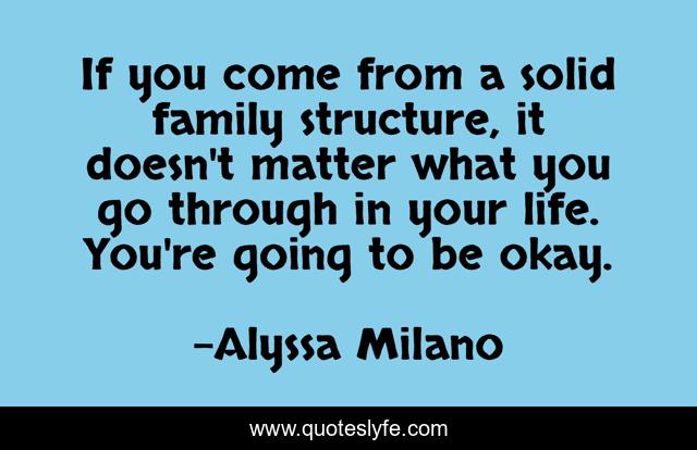 This page presents the quote "If you come from a solid family structure, it doesn't matter what you go through in your life. You're going to be okay.". Author of this quote is Alyssa Milano. This quote is about matter, life,.
