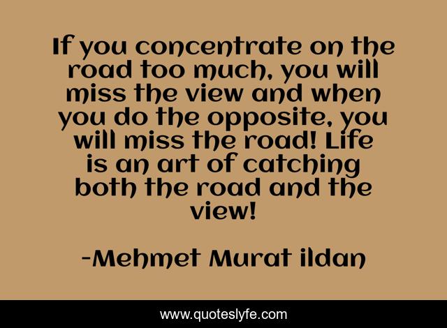 This page presents the quote "If you concentrate on the road too much, you will miss the view and when you do the opposite, you will miss the road! Life is an art of catching both the road and the view!". Author of this quote is Mehmet Murat ildan. This quote is about turkish-aphorisms, life, mehmet-murat-ildan, ildan-wise-sayings, turkish, ildan-wisdom, turkish-sayings, turkish-playwrights, life-philosophy,.