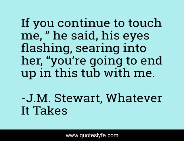 This page presents the quote "If you continue to touch me, ” he said, his eyes flashing, searing into her, “you’re going to end up in this tub with me.". Author of this quote is J.M. Stewart, Whatever It Takes. This quote is about contemporary-romance, second-chances,.