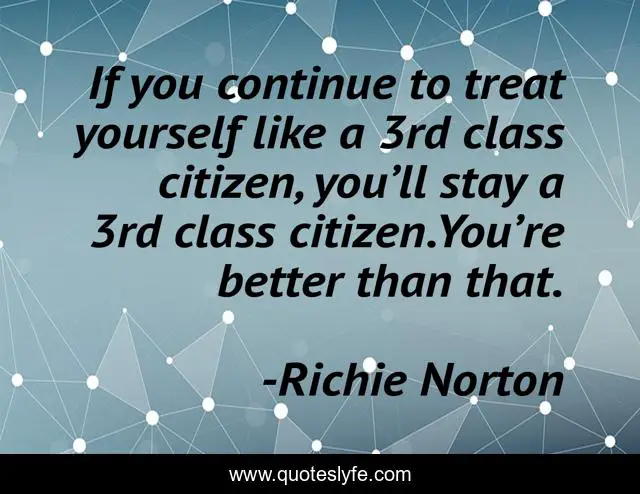 This page presents the quote "If you continue to treat yourself like a 3rd class citizen, you’ll stay a 3rd class citizen.You’re better than that.". Author of this quote is Richie Norton. This quote is about self-love, richie-norton, third-class, first, better, self-help, first-class, care, class,.