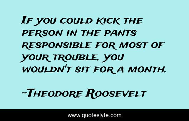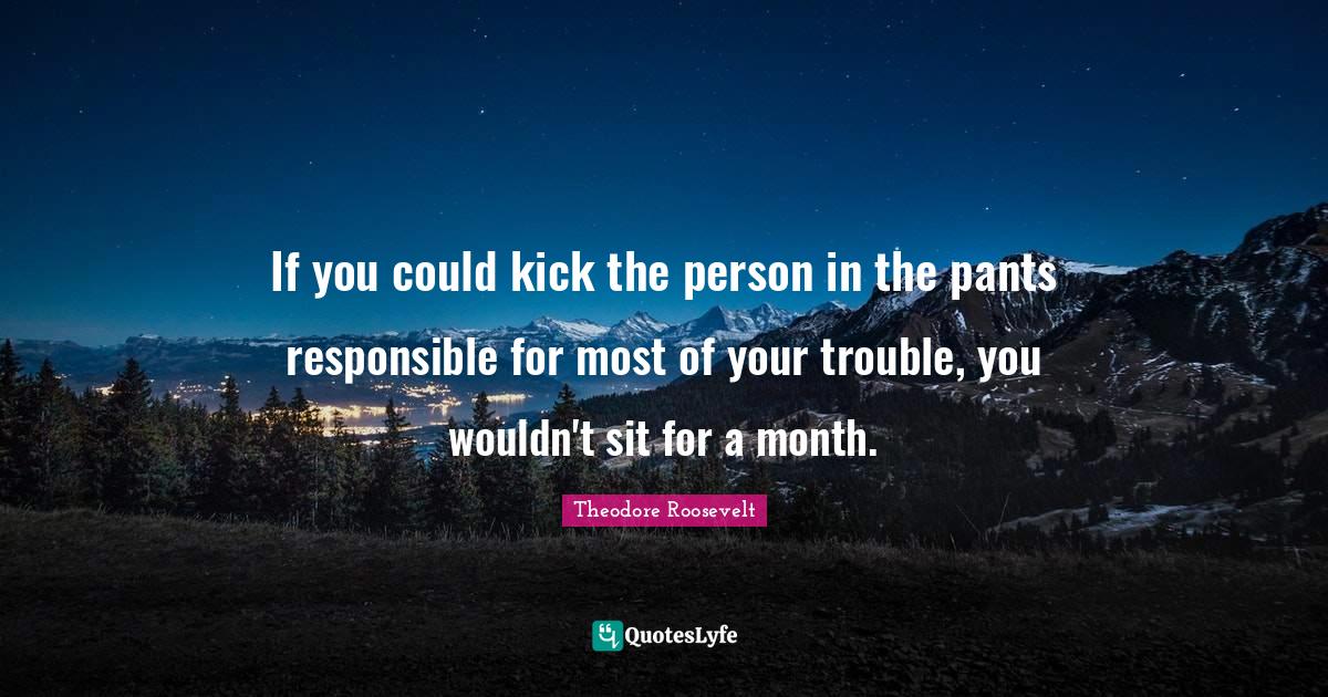 This page presents the quote "If you could kick the person in the pants responsible for most of your trouble, you wouldn't sit for a month.". Author of this quote is Theodore Roosevelt. This quote is about person, responsible,.