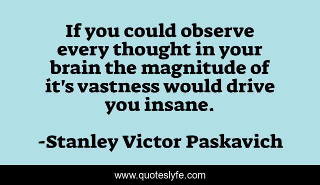 This page presents the quote "If you could observe every thought in your brain the magnitude of it's vastness would drive you insane.". Author of this quote is Stanley Victor Paskavich. This quote is about unconscious-depth-psychology, consciousness-mind-brain, consciousness,.