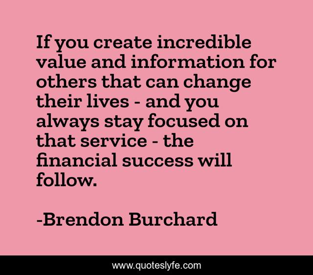 This page presents the quote "If you create incredible value and information for others that can change their lives - and you always stay focused on that service - the financial success will follow.". Author of this quote is Brendon Burchard. This quote is about change, service, value,.