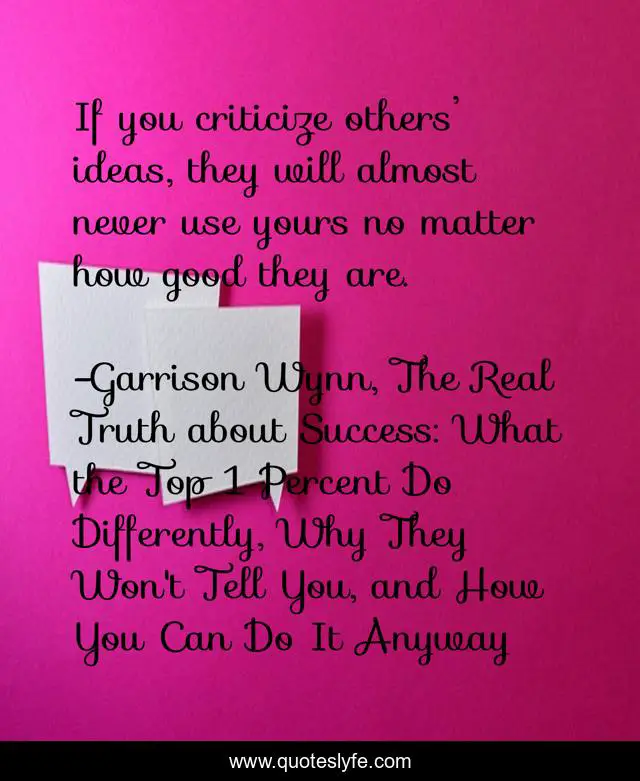 "Garrison Wynn, The Real Truth about Success: What the Top 1 Percent Do Differently, Why They Won't Tell You, and How You Can Do It Anyway Quotes." Quoteslyfe.com, 2025. Sun. 07 Dec. 2025. <https://www.quoteslyfe.com/quote/If-you-criticize-others-ideas-they-will-185466>.