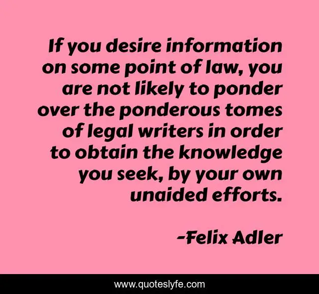 This page presents the quote "If you desire information on some point of law, you are not likely to ponder over the ponderous tomes of legal writers in order to obtain the knowledge you seek, by your own unaided efforts.". Author of this quote is Felix Adler. This quote is about information, law, knowledge,.
