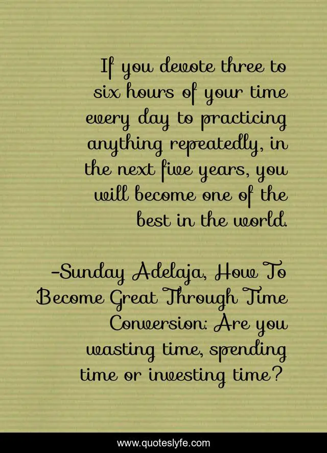 This page presents the quote "If you devote three to six hours of your time every day to practicing anything repeatedly, in the next five years, you will become one of the best in the world.". Author of this quote is Sunday Adelaja, How To Become Great Through Time Conversion: Are you wasting time, spending time or investing time?. This quote is about life, live-your-best-life, conversion, productivity, wealth, greatness, waste, humanity, product,.