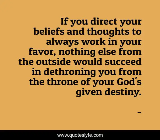 This page presents the quote "If you direct your beliefs and thoughts to always work in your favor, nothing else from the outside would succeed in dethroning you from the throne of your God's given destiny.". Author of this quote is . This quote is about thoughts-working-in-your-favor, positive-beliefs-and-thoughts, edmond-mbiaka, your-true-destiny, directing-your-thoughts, your-god-s-given-destiny, your-beliefs-and-thoughts,.