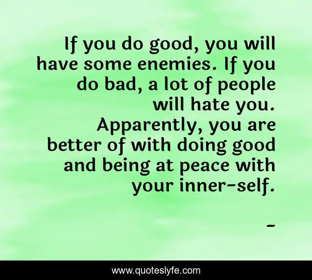 This page presents the quote "If you do good, you will have some enemies. If you do bad, a lot of people will hate you. Apparently, you are better of with doing good and being at peace with your inner-self.". Author of this quote is . This quote is about edmond-mbiaka, doing-bad, doing-good,.