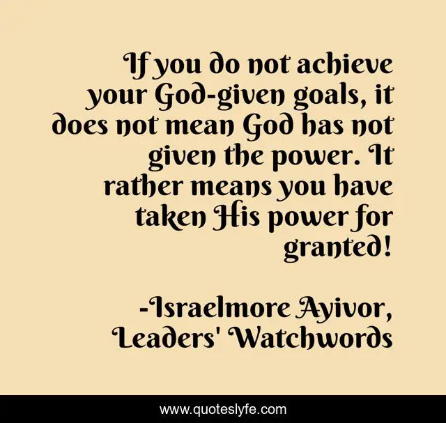 This page presents the quote "If you do not achieve your God-given goals, it does not mean God has not given the power. It rather means you have taken His power for granted!". Author of this quote is Israelmore Ayivor, Leaders' Watchwords. This quote is about achievements, gifts, achieve-your-goals, plans, desires, god, achieve-your-dreams, powerful, food-for-thought,.