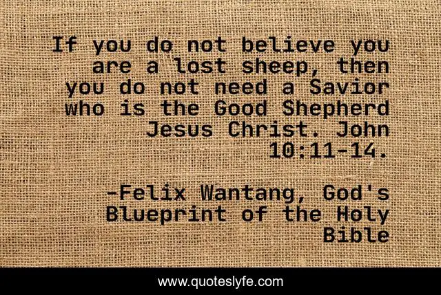 This page presents the quote "If you do not believe you are a lost sheep, then you do not need a Savior who is the Good Shepherd Jesus Christ. John 10:11-14.". Author of this quote is Felix Wantang, God's Blueprint of the Holy Bible. This quote is about jesus-christ, sheep, good, lost, shepherd, god, holy-bible, savior, believe,.