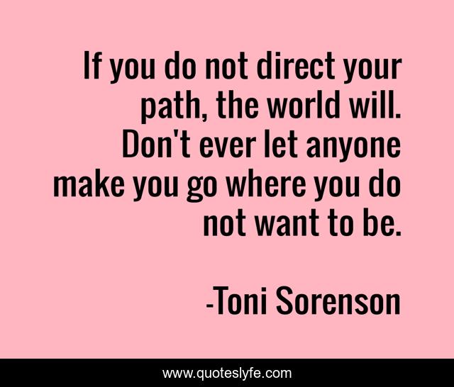 This page presents the quote "If you do not direct your path, the world will. Don't ever let anyone make you go where you do not want to be.". Author of this quote is Toni Sorenson. This quote is about life, success, choice, health, fitness, path,.