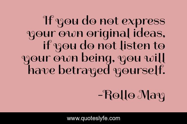 This page presents the quote "If you do not express your own original ideas, if you do not listen to your own being, you will have betrayed yourself.". Author of this quote is Rollo May. This quote is about ideas, yourself,.