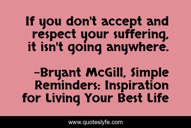 This page presents the quote "If you don't accept and respect your suffering, it isn't going anywhere.". Author of this quote is Bryant McGill, Simple Reminders: Inspiration for Living Your Best Life. This quote is about respect, suffering, acceptance,.